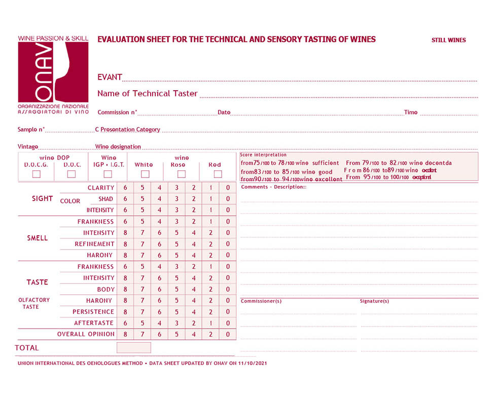 ONAV sheets are structured to evaluate wine according to standardized and objective parameters, with the aim of providing a technical and precise assessment of its characteristics.